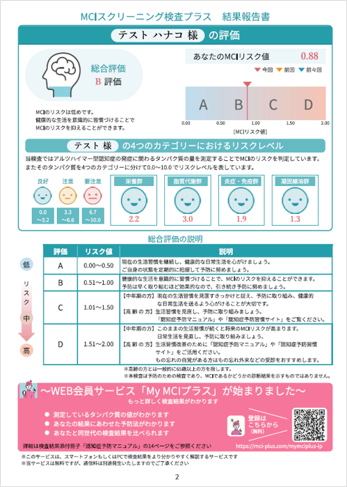 測定したタンパク質の値をもとに、0.00~2.00の範囲内でMCIのリスク値を出しています。0.00に近いほどリスクは低く、2.00に近いほどリスクは高くなっています。リスク値によってA~Dの評価がつけられており、A・Bが低リスク、Cが中リスク、Dが高リスクです。リスク値は生活習慣によって改善する可能性があります。