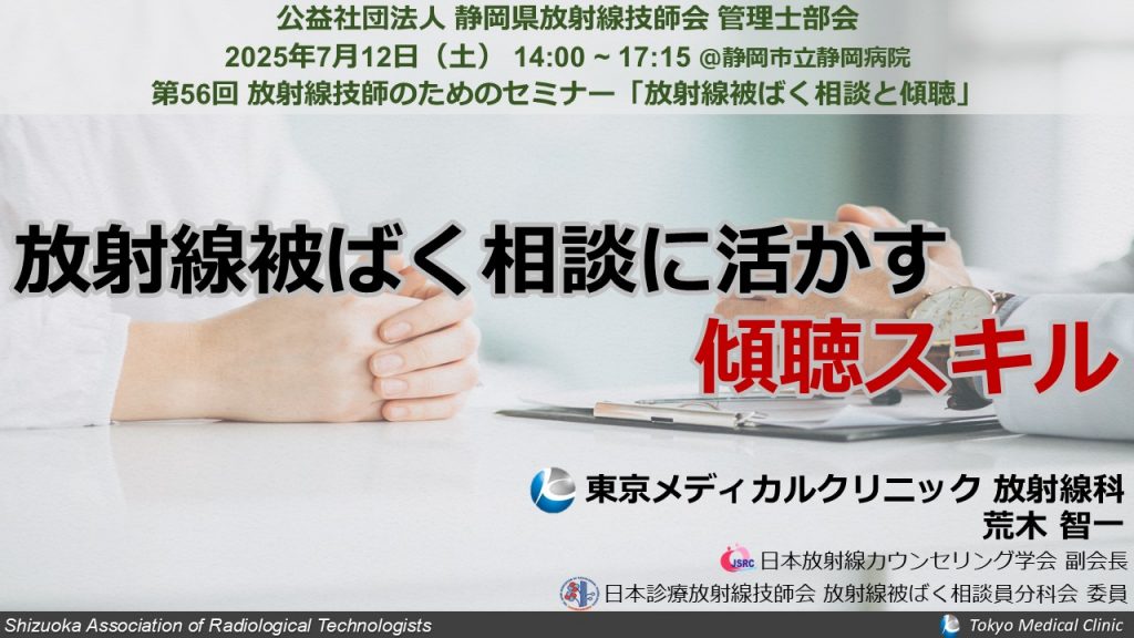 2025年7月12日 静岡県放射線技師会主催の第56回 放射線技師のためのセミナー「放射線被ばく相談と傾聴」で当院の荒木が講演いたしました。